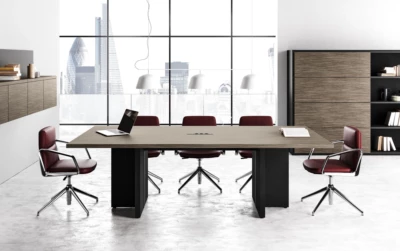 La gamme se décline également en tables de réunion, dont les lignes reprennent l’esthétique des bureaux de direction. Les pieds pannellés assurent un confort optimal pour tous les utilisateurs, y compris en bout de table, tandis que les modules de câblage centraux renforcent la fonctionnalité sans compromettre l’esthétique. Des solutions complémentaires – meubles monolithiques, éléments suspendus et rangements ouverts – viennent compléter l’aménagement avec cohérence.